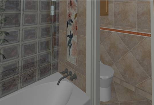 The master bath remodel brought light into the shower and tub area by the use of glass blocks in a beach-style shower and a tub-side “window” that brings light in from the atrium on the other side. The mosaic (custom-made) that was being considered for use on the tub wall was rendered with perfect accuracy and was confidently selected at that point. Additionally, as a surprise for her husband, the wife had the somewhat “risky” idea of putting mural of Hawaii in the shower. We were able to find and identify the actual photo that she had in mind, accurately place it, and enable viewing from various angles inside the shower. She went forward with the idea and the couple was delighted with the visually stunning result. |
