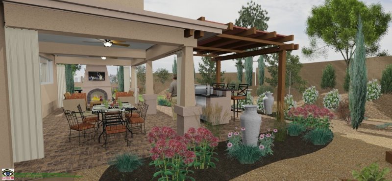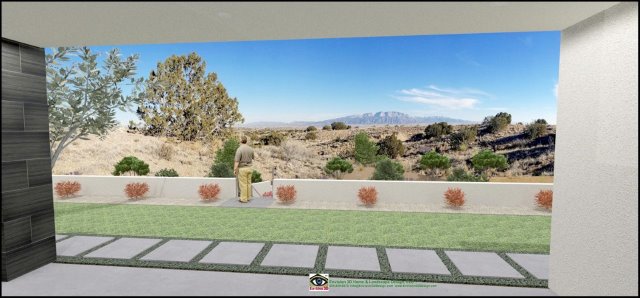 Mariposa Parade of Homes Landscape | The final design is a xeric oasis that employs site and microclimate appropriate selections of hardy, low-maintenance, yet showy, plantings. Flowers are all perennial and annuals that naturally reseed, so as to provide continual color, yet minimize work for the client. Trees and shrubs (both evergreen and deciduous) have been carefully selected and placed to complement the home's modern-Zen aesthetic, as well to provide wintertime interest and structure. Many of the plants are native to southwestern New Mexico; others are perfect complements to our high-desert climate and environment. |